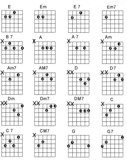 M = mayor, m = minor, 7 = dalam praktek secara sederhana biasanya digunakan akan berpindah ke kunci gitar lain.