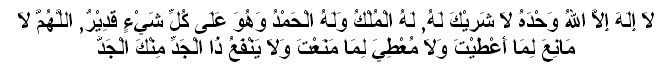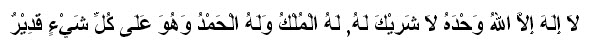 (tidak ada sesembahan yang berhak disembah dengan benar kecuali Allah, tidak ada sekutu bagi-Nya, milik-Nya kerajaan dan segala pujian. Dia-lah yang Maha Kuasa atas segala sesuatu)